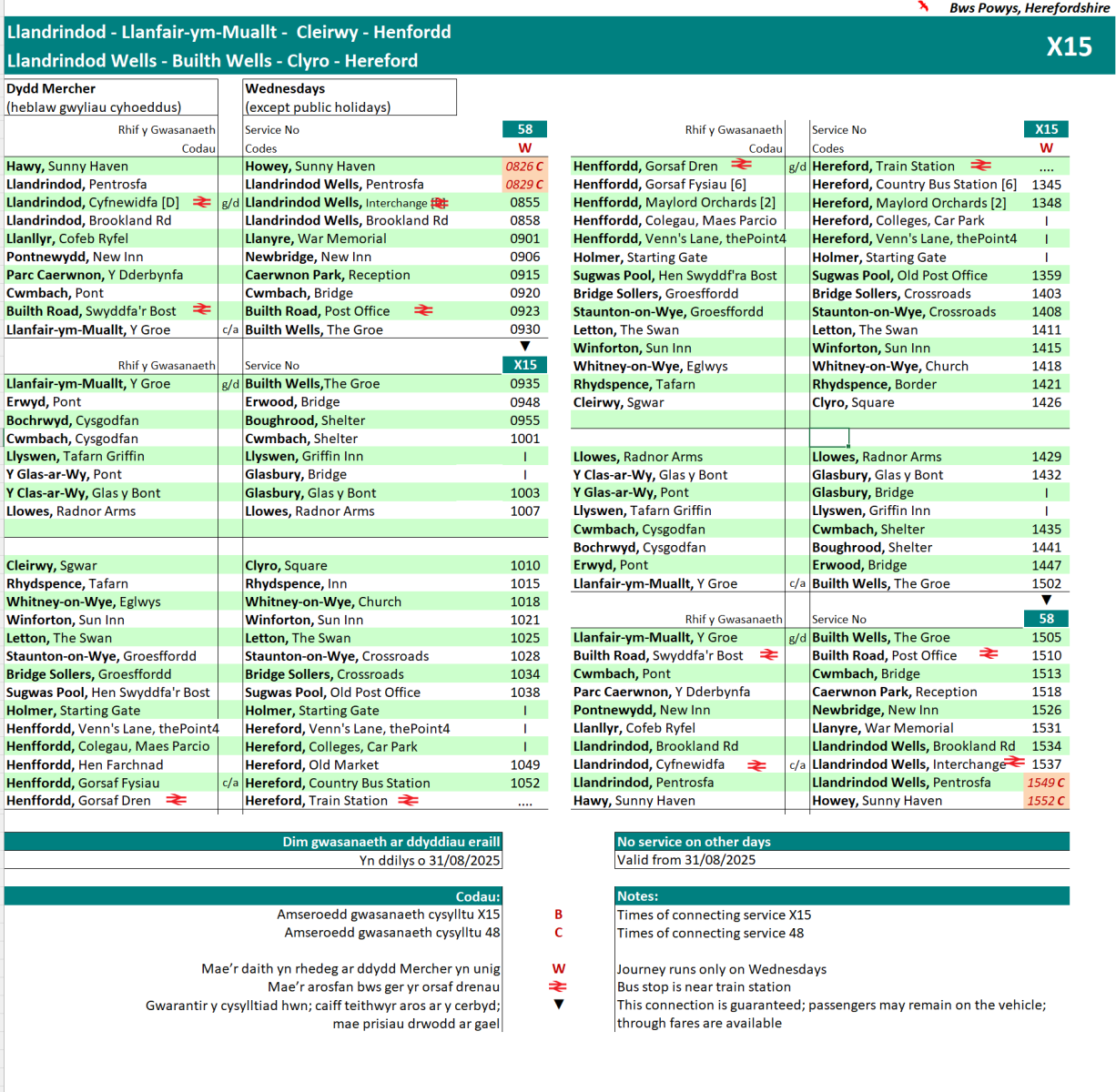 X15 Timetable (Market Days - Wednesday's Only)